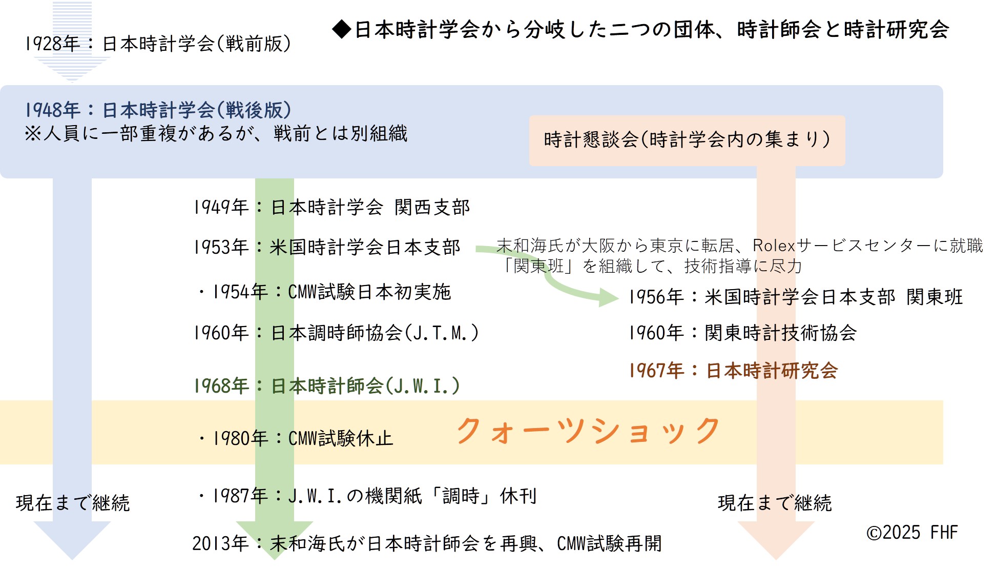 「日本時計研究会」は、戦後の時計技術向上の熱意の中から生まれ、特にCMW試験という高度な技術資格を目指す技術者たちの勉強の場として関東で育ちました。